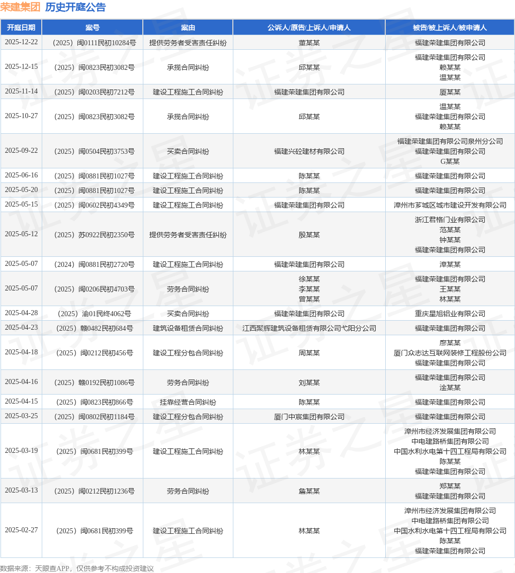 案号:(2025)闽0823民初3082号根据统计,近一年内以福建荣建集团有限公司为当事人的历史开庭公告有28则,其中案由为“买卖合同纠纷”的公告以8则居首,其次为“建设工程施工合同纠纷”有7则,“劳务合同纠纷”有3则。历史开庭公告(前20条)如下: