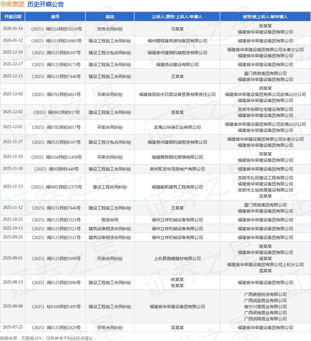 案号:(2025)闽0125民初4173号根据统计,近一年内以福建省华荣建设集团有限公司为当事人的历史开庭公告有65则,其中案由为“建设工程施工合同纠纷”的公告以27则居首,其次为“买卖合同纠纷”有17则,“建设工程分包合同纠纷”有5则。历史开庭公告(前20条)如下: