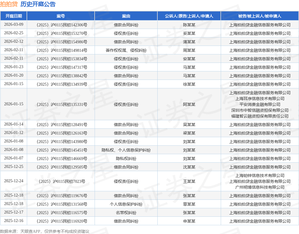 案号:(2025)沪0115民初116575号根据统计,近一年内以上海拍拍贷金融信息服务有限公司为当事人的历史开庭公告有106则,其中案由为“侵权责任纠纷”的公告以25则居首,其次为“借款合同纠纷”有25则,“个人信息保护纠纷”有13则。历史开庭公告(前20条)如下: