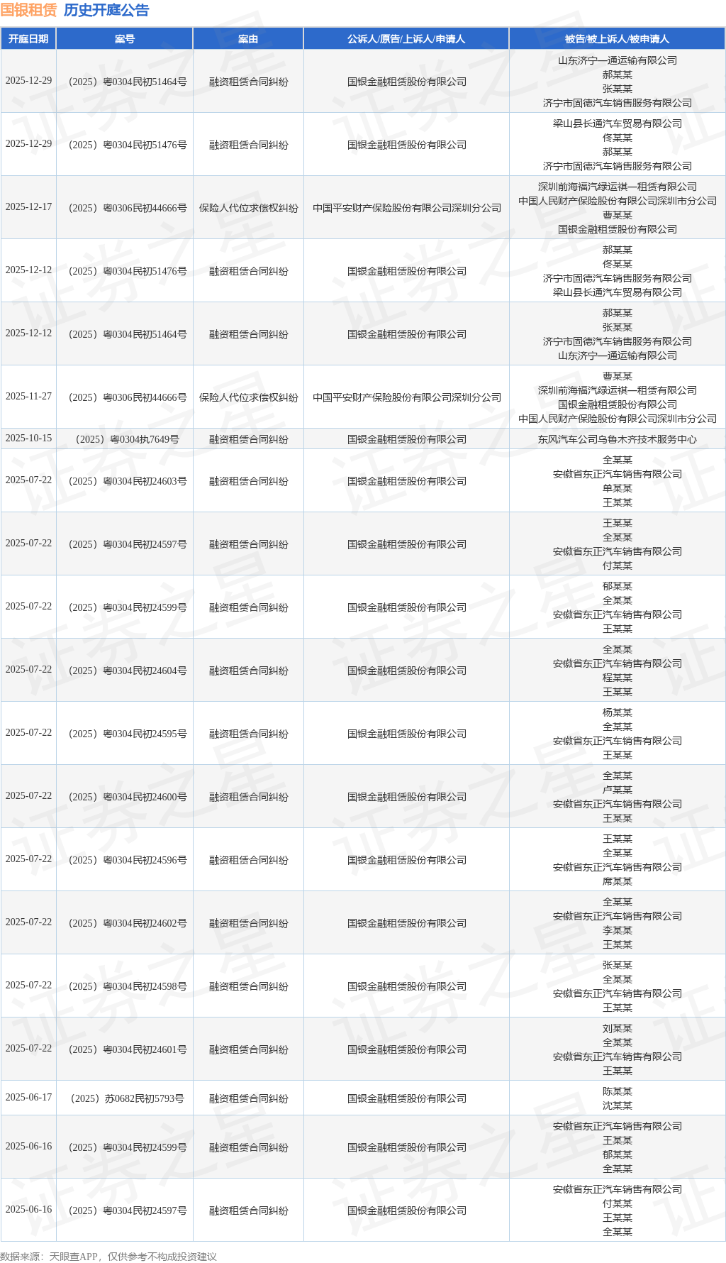案号:(2025)粤0306民初44666号根据统计,近一年内以国银金融租赁股份有限公司为当事人的历史开庭公告有32则,其中案由为“融资租赁合同纠纷”的公告以27则居首,其次为“保险人代位求偿权纠纷”有2则,“买卖合同纠纷”有1则。历史开庭公告(前20条)如下: