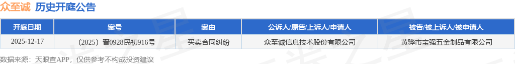 证券之星消息,根据天眼查APP显示,近日公布了一则众至诚信息技术股份有限公司作为原告/上诉人的开庭公告,详细内容如下: