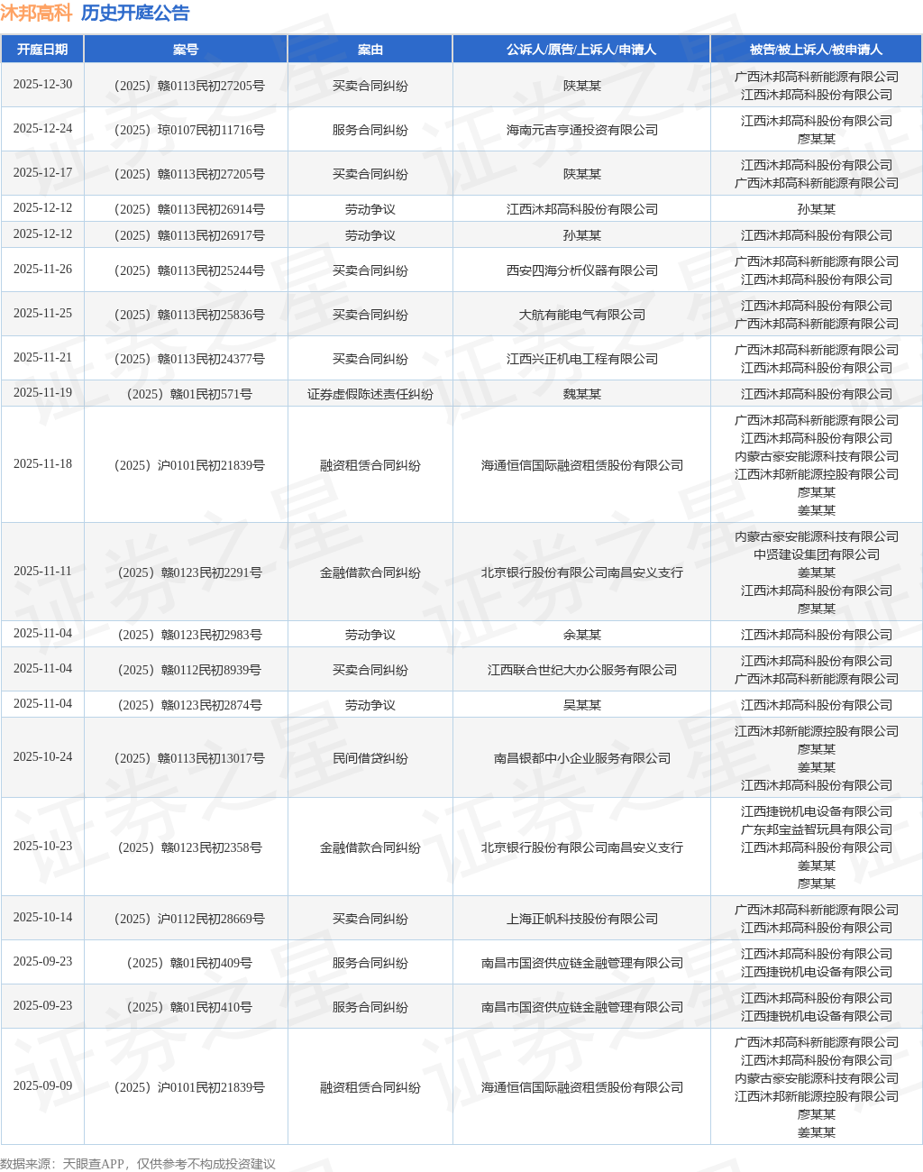 案号:(2025)赣0113民初27205号根据统计,近一年内以江西沐邦高科股份有限公司为当事人的历史开庭公告有40则,其中案由为“买卖合同纠纷”的公告以11则居首,其次为“票据追索权纠纷”有8则,“劳动争议”有4则。历史开庭公告(前20条)如下: