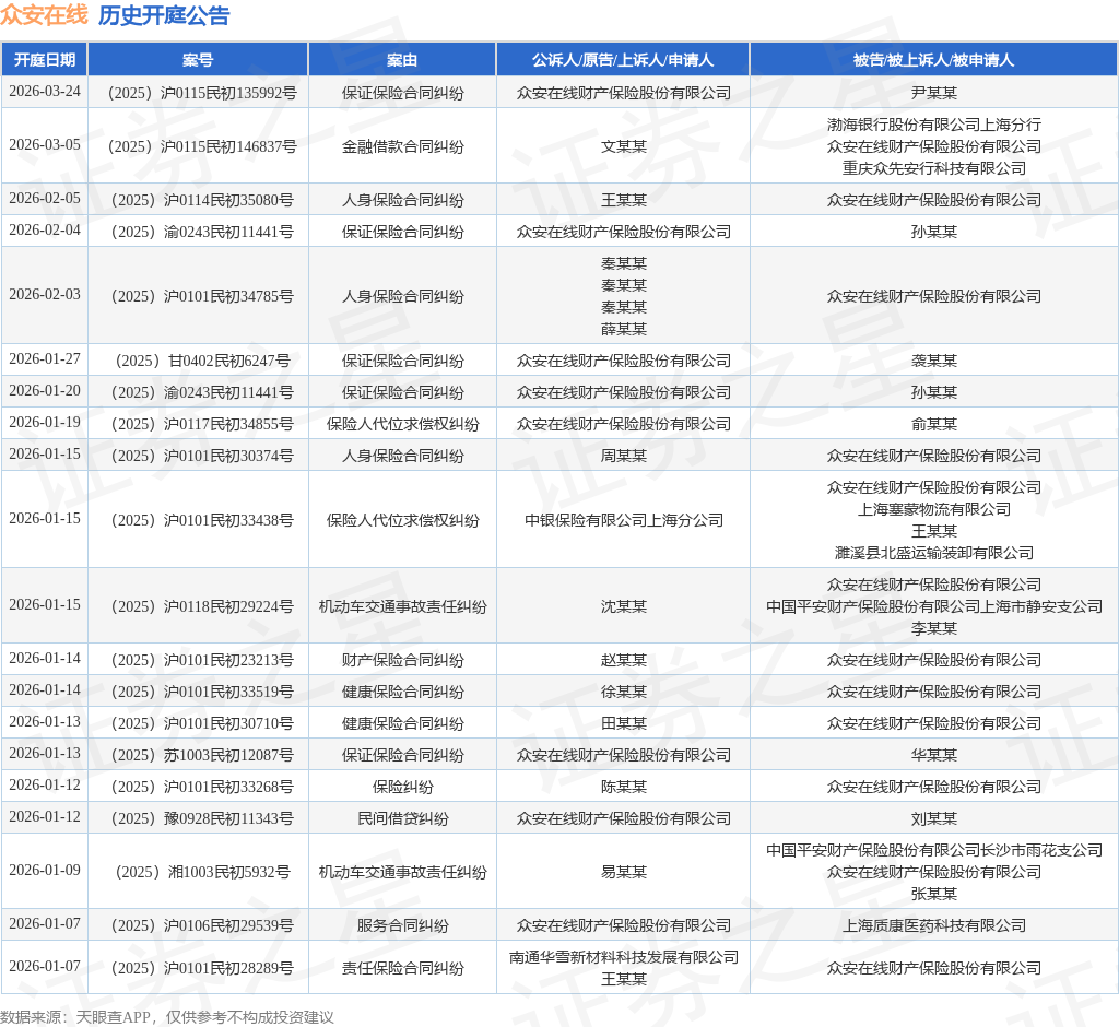 案号:(2025)沪0109民初23153号根据统计,近一年内以众安在线财产保险股份有限公司为当事人的历史开庭公告有4576则,其中案由为“保证保险合同纠纷”的公告以2966则居首,其次为“人身保险合同纠纷”有625则,“保险人代位求偿权纠纷”有289则。历史开庭公告(前20条)如下: