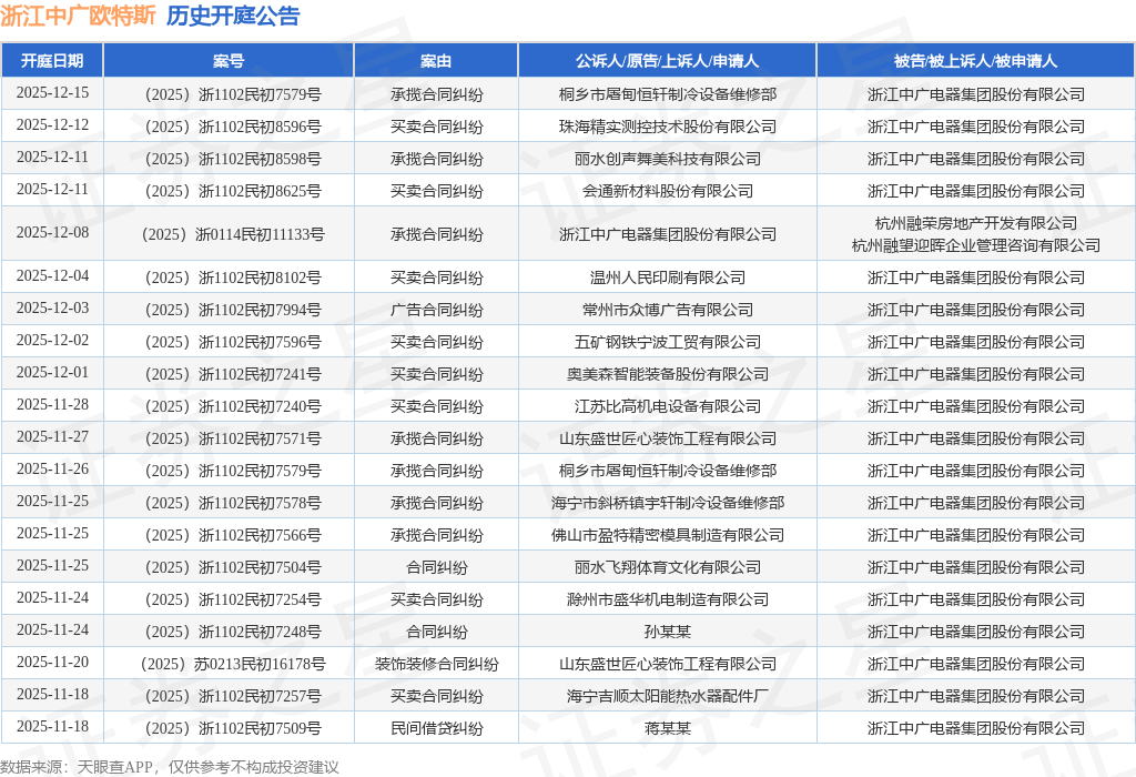 案号:(2025)浙1102民初7579号根据统计,近一年内以浙江中广电器集团股份有限公司为当事人的历史开庭公告有46则,其中案由为“买卖合同纠纷”的公告以20则居首,其次为“承揽合同纠纷”有18则,“合同纠纷”有3则。历史开庭公告(前20条)如下: