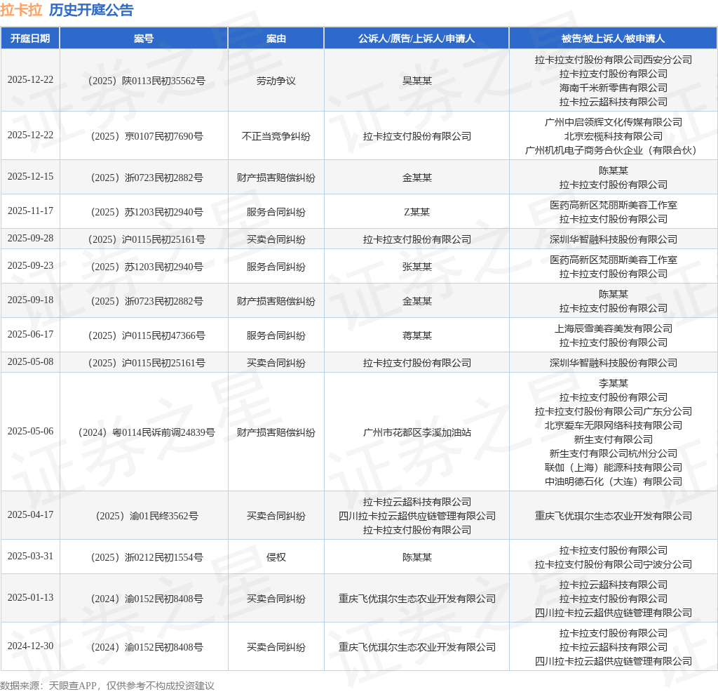 案号:(2025)浙0723民初2882号根据统计,近一年内以拉卡拉支付股份有限公司为当事人的历史开庭公告有14则,其中案由为“买卖合同纠纷”的公告以5则居首,其次为“服务合同纠纷”有3则,“财产损害赔偿纠纷”有3则。历史开庭公告如下: