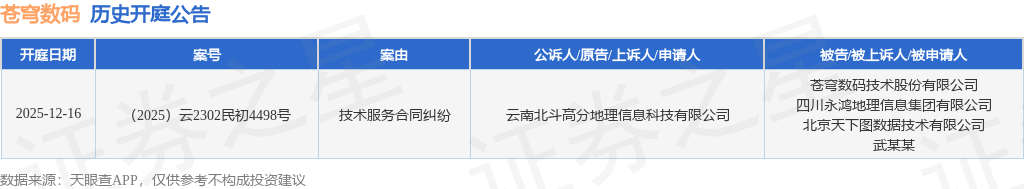 证券之星消息,根据天眼查APP显示,近日公布了一则苍穹数码技术股份有限公司作为被告/被上诉人的开庭公告,详细内容如下: