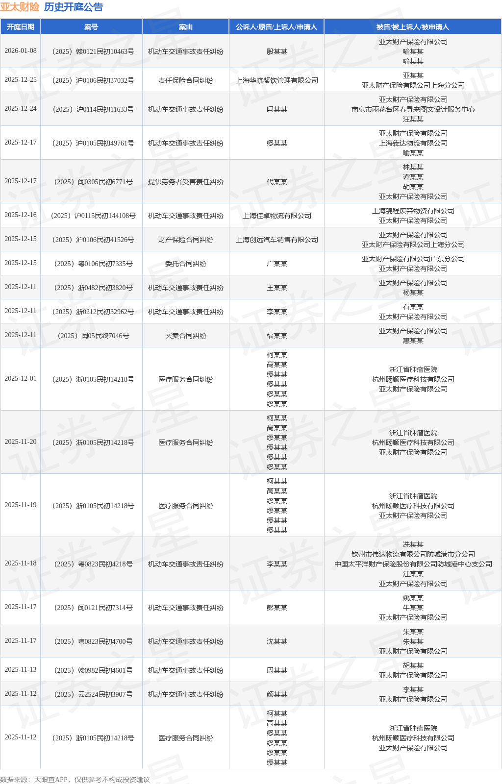案号:(2025)闽0305民初6771号根据统计,近一年内以亚太财产保险有限公司为当事人的历史开庭公告有180则,其中案由为“机动车交通事故责任纠纷”的公告以86则居首,其次为“保险人代位求偿权纠纷”有14则,“责任保险合同纠纷”有13则。历史开庭公告(前20条)如下: