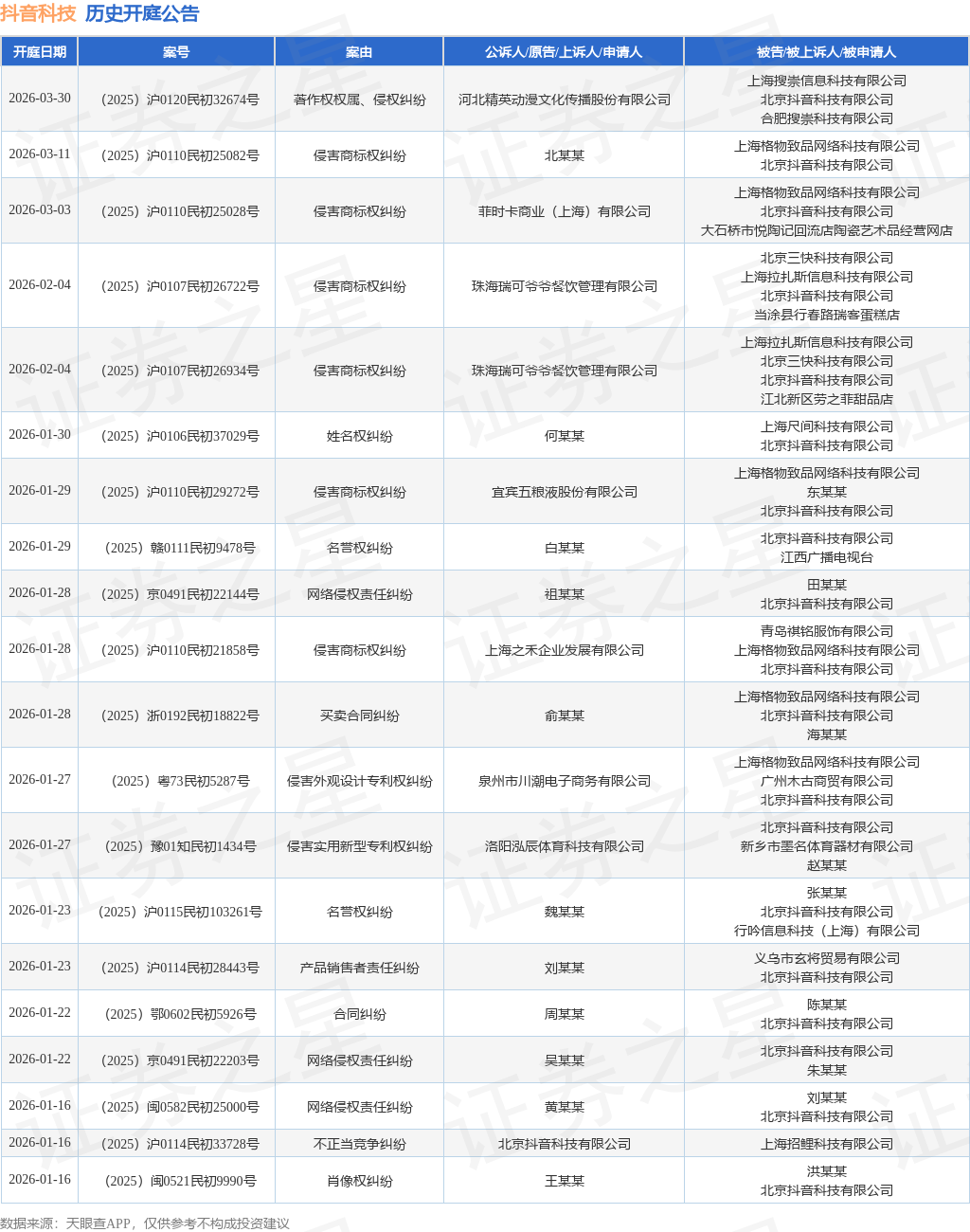 案号:(2025)浙0784民初10246号根据统计,近一年内以北京抖音科技有限公司为当事人的历史开庭公告有1600则,其中案由为“侵害外观设计专利权纠纷”的公告以203则居首,其次为“侵害商标权纠纷”有174则,“侵害作品信息网络传播权纠纷”有169则。历史开庭公告(前20条)如下: