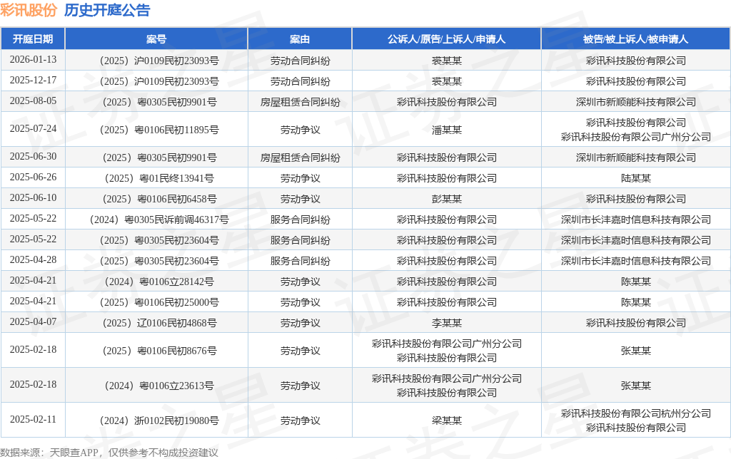 根据统计,近一年内以彩讯科技股份有限公司为当事人的历史开庭公告有16则,其中案由为“劳动争议”的公告以9则居首,其次为“服务合同纠纷”有3则,“劳动合同纠纷”有2则。历史开庭公告如下: