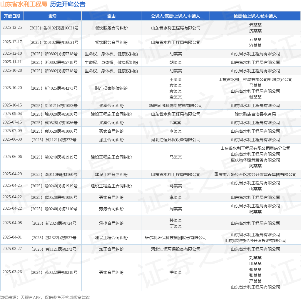 案号:(2025)鲁0102民初16621号根据统计,近一年内以山东省水利工程局有限公司为当事人的历史开庭公告有29则,其中案由为“买卖合同纠纷”的公告以7则居首,其次为“建设工程施工合同纠纷”有5则,“建设工程合同纠纷”有4则。历史开庭公告(前20条)如下: