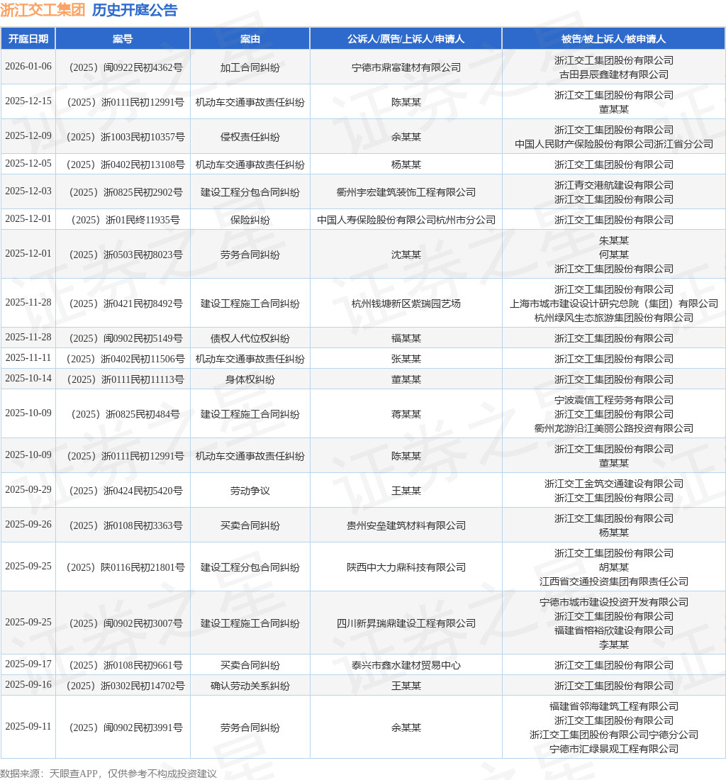 案号:(2025)浙0111民初12991号根据统计,近一年内以浙江交工集团股份有限公司为当事人的历史开庭公告有61则,其中案由为“建设工程施工合同纠纷”的公告以13则居首,其次为“建设工程分包合同纠纷”有6则,“买卖合同纠纷”有5则。历史开庭公告(前20条)如下: