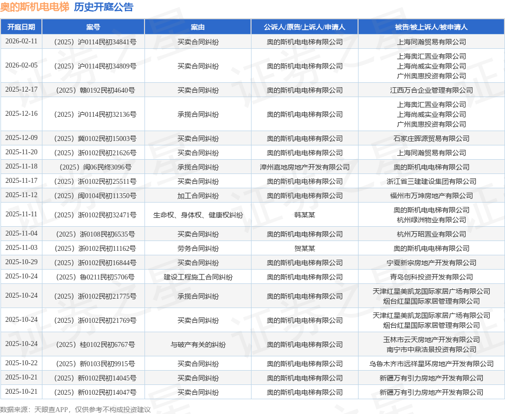 案号:(2025)赣0192民初4640号根据统计,近一年内以奥的斯机电电梯有限公司为当事人的历史开庭公告有229则,其中案由为“买卖合同纠纷”的公告以99则居首,其次为“承揽合同纠纷”有66则,“建设工程施工合同纠纷”有18则。历史开庭公告(前20条)如下: