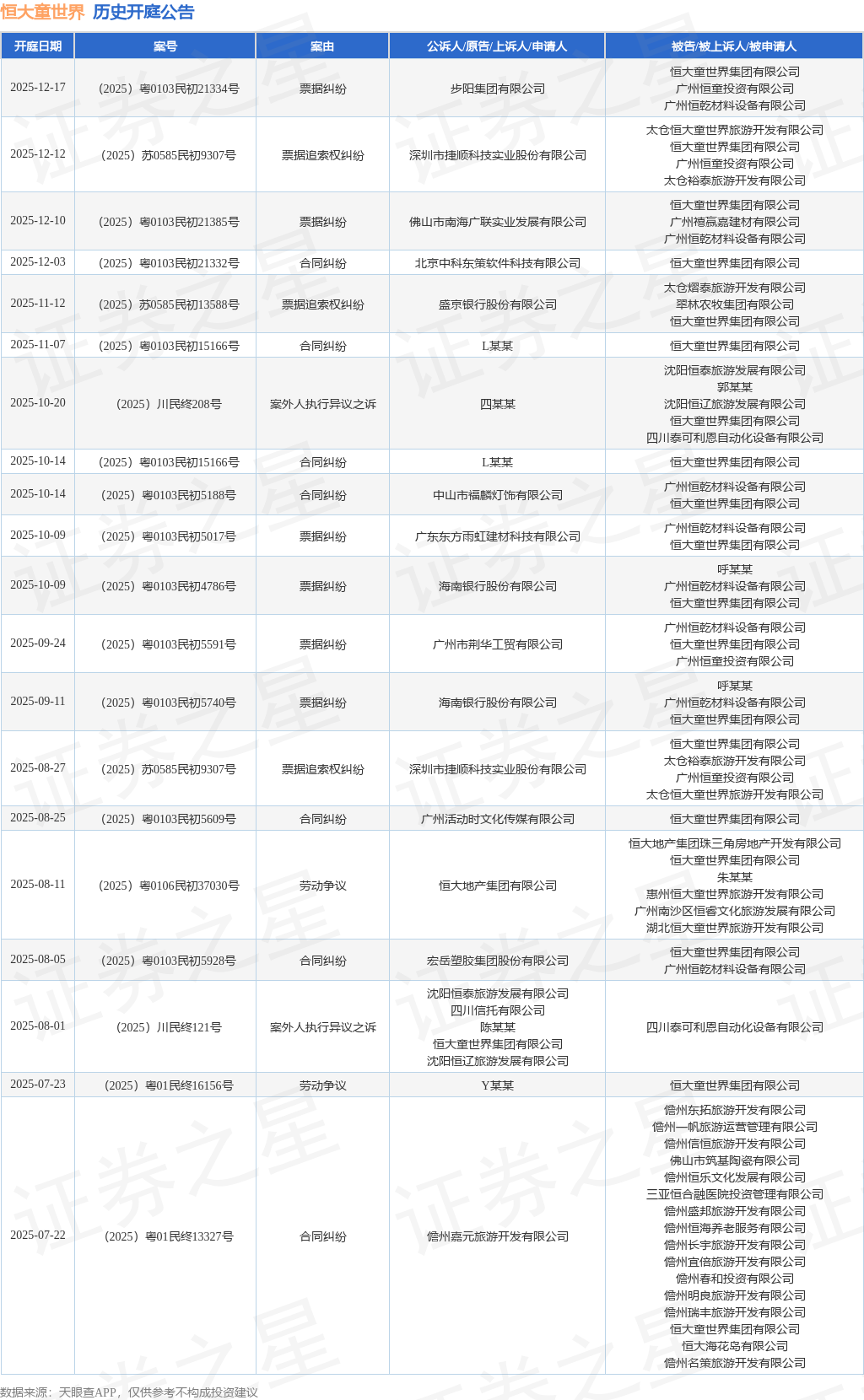 案号:(2025)粤0103民初21334号根据统计,近一年内以恒大童世界集团有限公司为当事人的历史开庭公告有108则,其中案由为“合同纠纷”的公告以22则居首,其次为“票据纠纷”有16则,“建设工程施工合同纠纷”有14则。历史开庭公告(前20条)如下:
