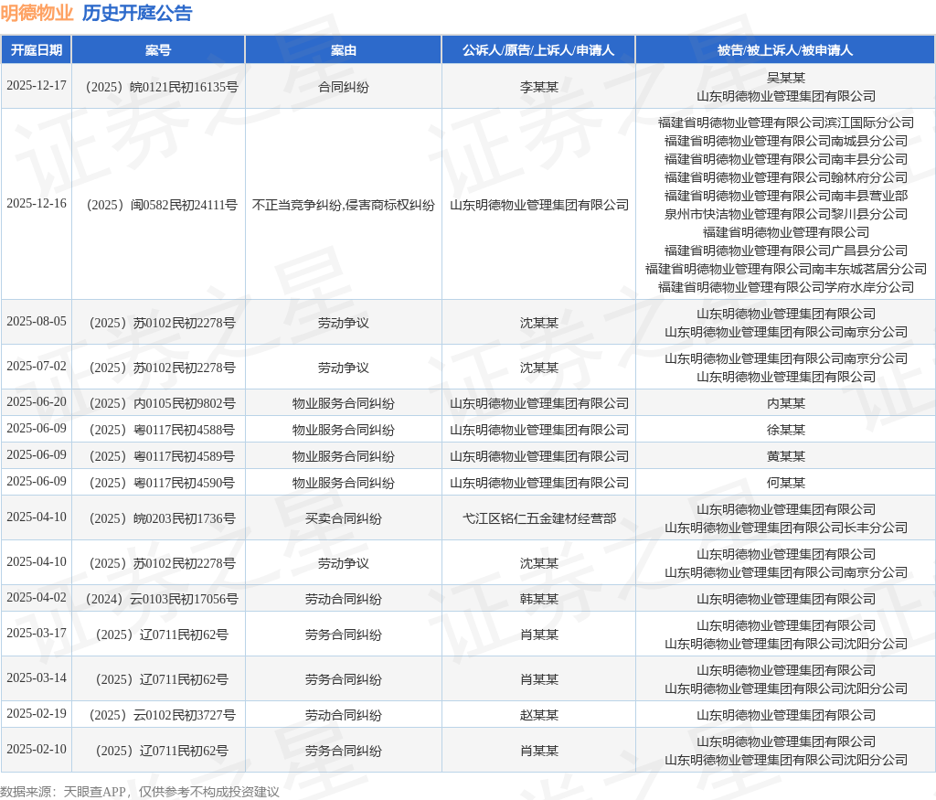 案号:(2025)皖0121民初16135号根据统计,近一年内以山东明德物业管理集团有限公司为当事人的历史开庭公告有15则,其中案由为“物业服务合同纠纷”的公告以4则居首,其次为“劳务合同纠纷”有3则,“劳动争议”有3则。历史开庭公告如下: