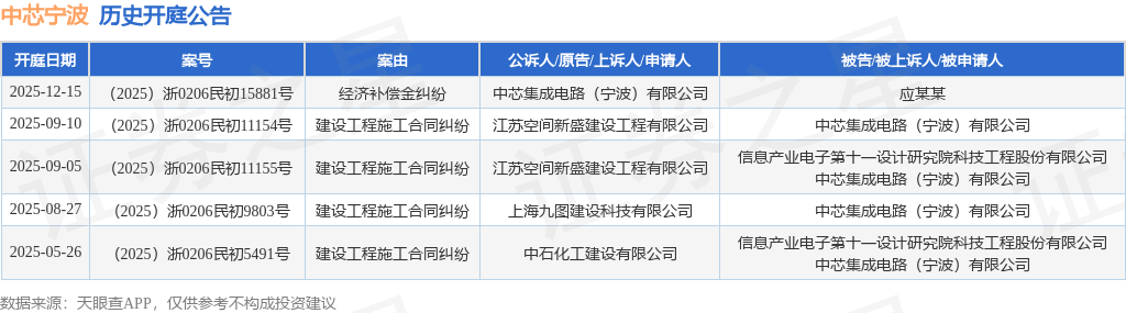 根据统计,近一年内以中芯集成电路(宁波)有限公司为当事人的历史开庭公告有5则,其中案由为“建设工程施工合同纠纷”的公告以4则居首,其次为“经济补偿金纠纷”有1则。历史开庭公告如下: