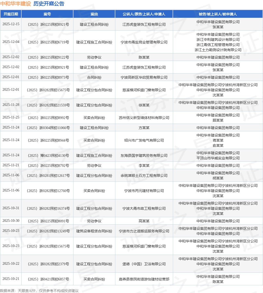 案号:(2025)浙0225民初8921号根据统计,近一年内以中和华丰建设集团有限公司为当事人的历史开庭公告有148则,其中案由为“买卖合同纠纷”的公告以35则居首,其次为“建设工程施工合同纠纷”有25则,“建设工程分包合同纠纷”有15则。历史开庭公告(前20条)如下: