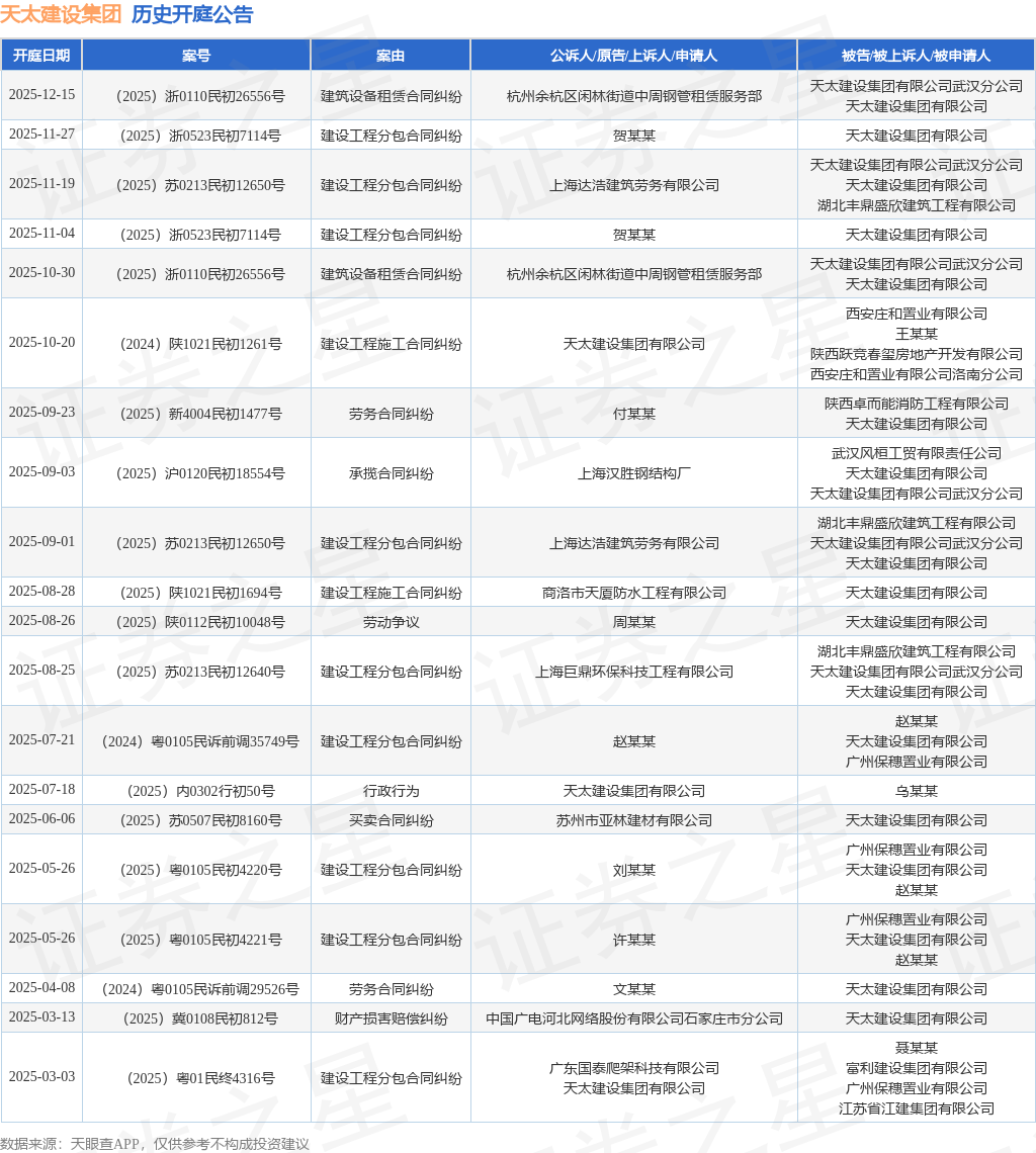 案号:(2025)浙0110民初26556号根据统计,近一年内以天太建设集团有限公司为当事人的历史开庭公告有27则,其中案由为“建设工程分包合同纠纷”的公告以10则居首,其次为“买卖合同纠纷”有4则,“建设工程施工合同纠纷”有4则。历史开庭公告(前20条)如下: