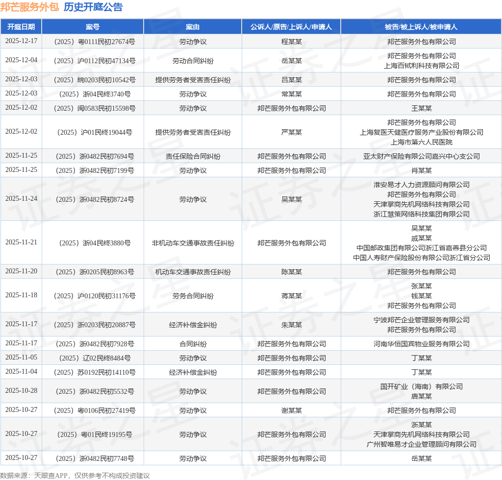案号:(2025)粤0111民初27674号根据统计,近一年内以邦芒服务外包有限公司为当事人的历史开庭公告有150则,其中案由为“劳动争议”的公告以67则居首,其次为“劳动合同纠纷”有16则,“服务合同纠纷”有8则。历史开庭公告(前20条)如下: