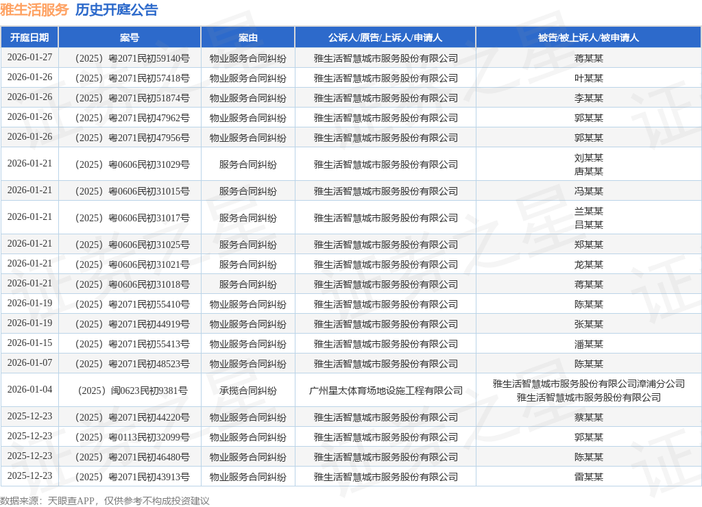 案号:(2025)粤2071民初53410号根据统计,近一年内以雅生活智慧城市服务股份有限公司为当事人的历史开庭公告有499则,其中案由为“物业服务合同纠纷”的公告以366则居首,其次为“服务合同纠纷”有54则,“物业服务合同”有14则。历史开庭公告(前20条)如下: