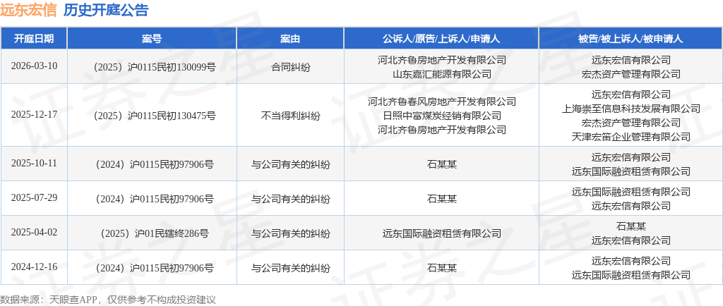 根据统计,近一年内以远东宏信有限公司为当事人的历史开庭公告有6则,其中案由为“与公司有关的纠纷”的公告以4则居首,其次为“不当得利纠纷”有1则,“合同纠纷”有1则。历史开庭公告如下: