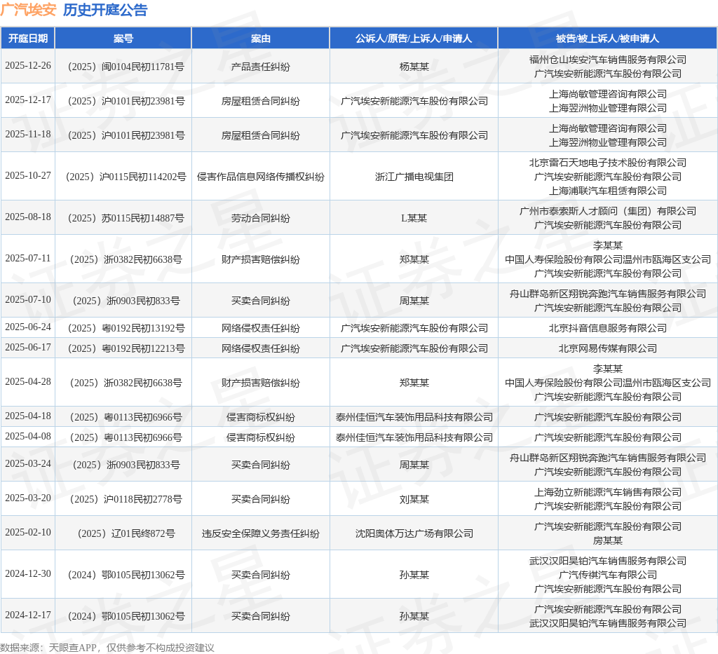 案号:(2025)沪0101民初23981号根据统计,近一年内以广汽埃安新能源汽车股份有限公司为当事人的历史开庭公告有17则,其中案由为“买卖合同纠纷”的公告以5则居首,其次为“侵害商标权纠纷”有2则,“房屋租赁合同纠纷”有2则。历史开庭公告如下: