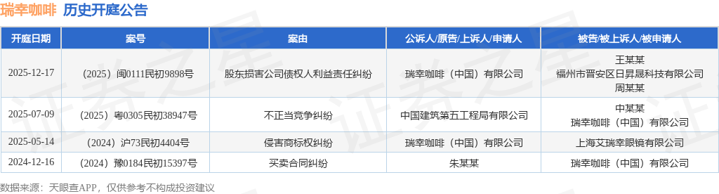 案号:(2025)闽0111民初9898号根据统计,近一年内以瑞幸咖啡(中国)有限公司为当事人的历史开庭公告有4则,其中案由为“不正当竞争纠纷”的公告以1则居首,其次为“买卖合同纠纷”有1则,“侵害商标权纠纷”有1则。历史开庭公告如下: