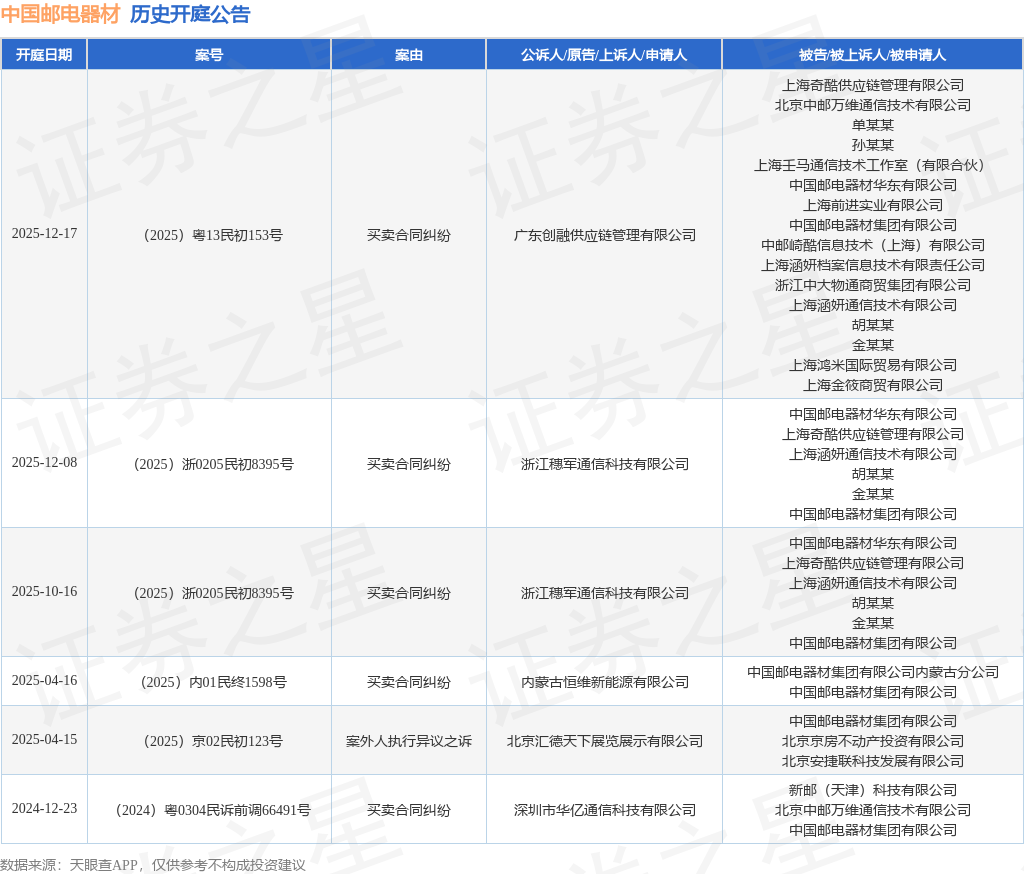 根据统计,近一年内以中国邮电器材集团有限公司为当事人的历史开庭公告有6则,其中案由为“买卖合同纠纷”的公告以5则居首,其次为“案外人执行异议之诉”有1则。历史开庭公告如下: