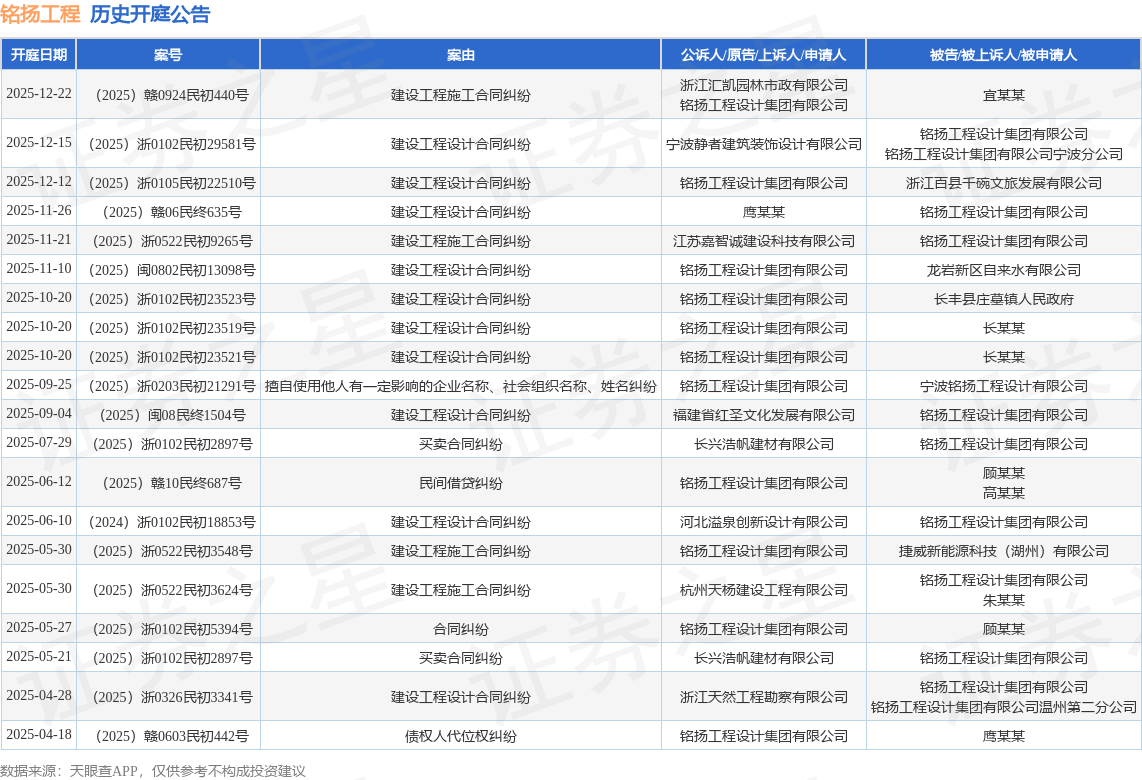 案号:(2025)浙0102民初29581号根据统计,近一年内以铭扬工程设计集团有限公司为当事人的历史开庭公告有25则,其中案由为“建设工程设计合同纠纷”的公告以12则居首,其次为“建设工程施工合同纠纷”有6则,“买卖合同纠纷”有2则。历史开庭公告(前20条)如下: