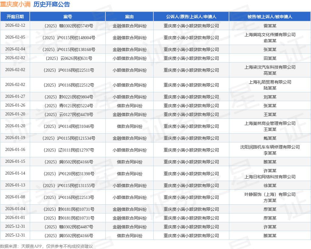 案号:(2025)沪民申5484号根据统计,近一年内以重庆度小满小额贷款有限公司为当事人的历史开庭公告有2220则,其中案由为“小额借款合同纠纷”的公告以1156则居首,其次为“金融借款合同纠纷”有446则,“借款合同纠纷”有387则。历史开庭公告(前20条)如下:
