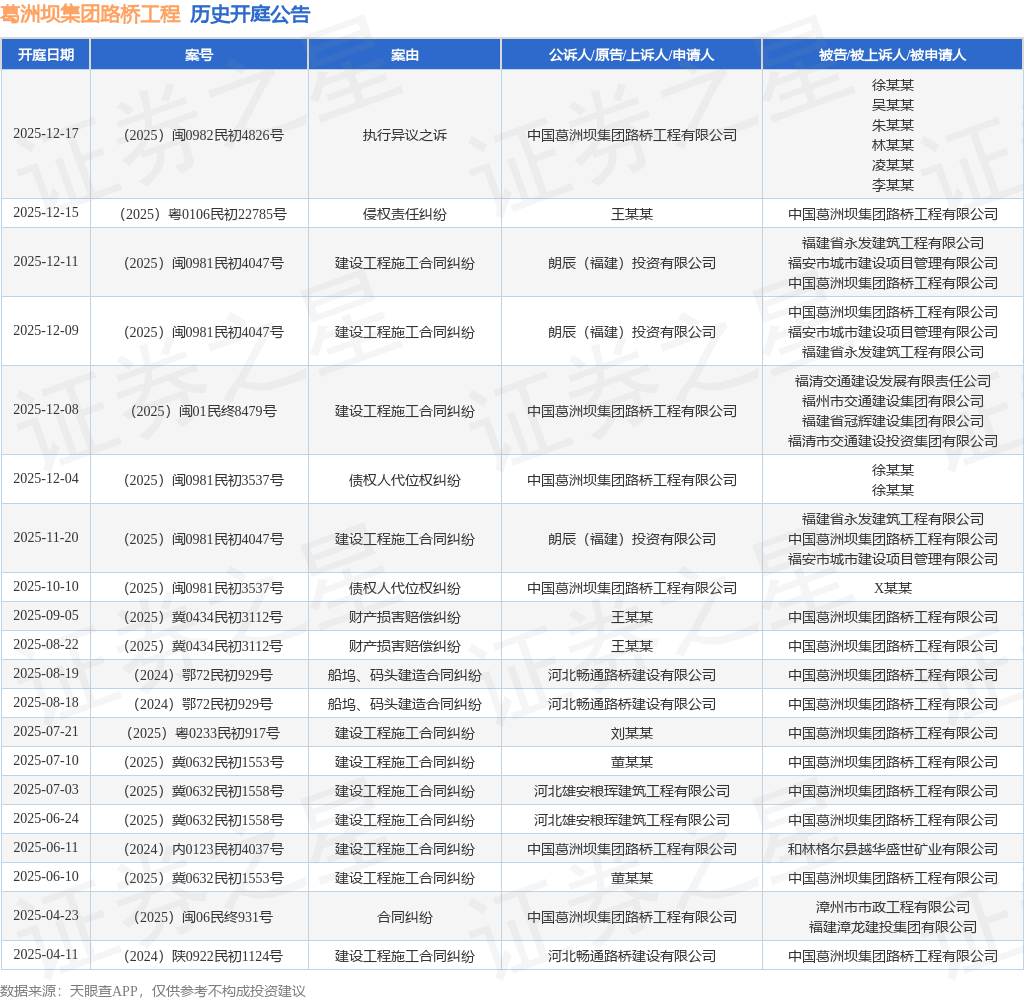 案号:(2025)闽0982民初4826号根据统计,近一年内以中国葛洲坝集团路桥工程有限公司为当事人的历史开庭公告有25则,其中案由为“建设工程施工合同纠纷”的公告以13则居首,其次为“债权人代位权纠纷”有2则,“合同纠纷”有2则。历史开庭公告(前20条)如下: