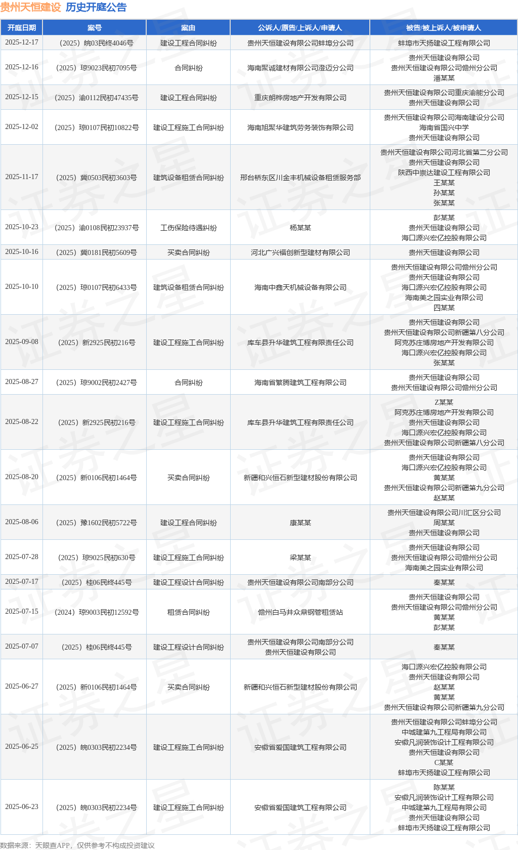 案号:(2025)皖03民终4046号根据统计,近一年内以贵州天恒建设有限公司为当事人的历史开庭公告有46则,其中案由为“建设工程施工合同纠纷”的公告以11则居首,其次为“买卖合同纠纷”有9则,“劳务合同纠纷”有4则。历史开庭公告(前20条)如下: