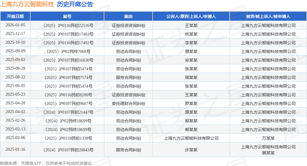 案号:(2025)沪0107民初17483号根据统计,近一年内以上海九方云智能科技有限公司为当事人的历史开庭公告有15则,其中案由为“劳动合同纠纷”的公告以8则居首,其次为“证券投资咨询纠纷”有4则,“服务合同纠纷”有2则。历史开庭公告如下: