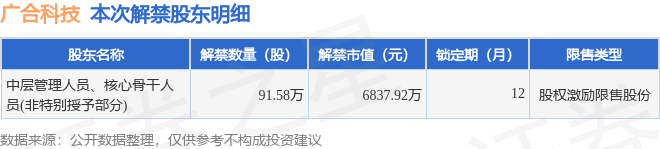 证券之星消息,根据市场公开信息整理,广合科技(001389)于12月15日将有91.58万股限售股份解禁,为公司股权激励限售股份,占公司总股本0.22%。(本次数据根据历史公告整理得出,实际情况以上市公司最新公告为准)最近一年内,该股累计解禁1.12亿股,占总股本的26.35%。本次解禁后,公司还有2.75亿股限售股份,占总股本64.49%。具体如下图所示: