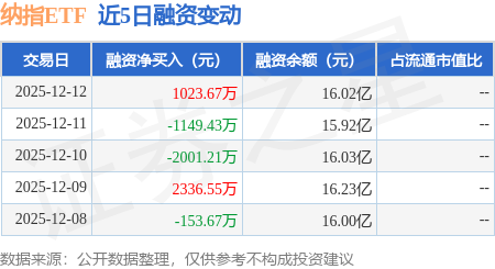 证券之星消息,12月12日,纳指ETF(159941)融资买入2.9亿元,融资偿还2.8亿元,融资净买入1023.67万元,融资余额16.02亿元。