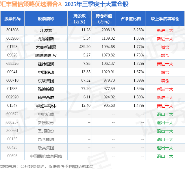 根据2025基金Q3季报公募基金重仓股数据,重仓该股的公募基金共3家,其中持有数量最多的公募基金为汇丰晋信基金的汇丰晋信策略优选混合A。汇丰晋信策略优选混合A目前规模为3.51亿元,最新净值1.4655(12月12日),较上一交易日上涨0.76%,近一年上涨22.21%。该公募基金现任基金经理为吴培文。吴培文在任的基金产品包括:汇丰晋信珠三角区域发展混合,管理时间为2017年6月2日至今,期间收益率为174.84%;汇丰晋信价值先锋股票A,管理时间为2019年5月18日至今,期间收益率为139.12%;汇丰晋信龙头优势混合A,管理时间为2022年9月27日至今,期间收益率为6.85%。