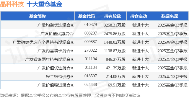 根据2025基金Q3季报公募基金重仓股数据,重仓该股的公募基金共8家,其中持有数量最多的公募基金为广发基金的广发均衡优选混合A。广发均衡优选混合A目前规模为22.82亿元,最新净值0.9181(12月12日),较上一交易日上涨1.43%,近一年下跌14.42%。该公募基金现任基金经理为王明旭。王明旭在任的基金产品包括:广发内需增长混合A,管理时间为2018年10月17日至今,期间收益率为120.38%;广发价值优势混合,管理时间为2020年3月2日至今,期间收益率为26.32%;广发稳健优选六个月持有期混合A,管理时间为2020年8月6日至今,期间收益率为-0.37%;