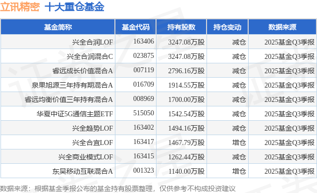 重仓立讯精密的前十大公募基金请见下表: