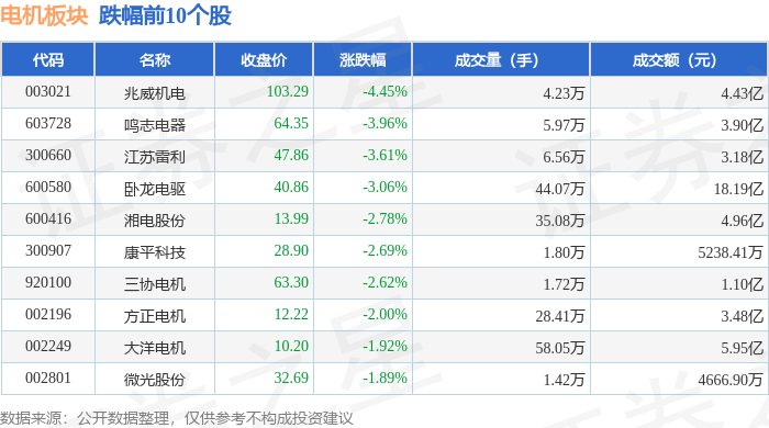 从资金流向上来看,当日电机板块主力资金净流出6.81亿元,游资资金净流入322.64万元,散户资金净流入6.78亿元。电机板块个股资金流向见下表: