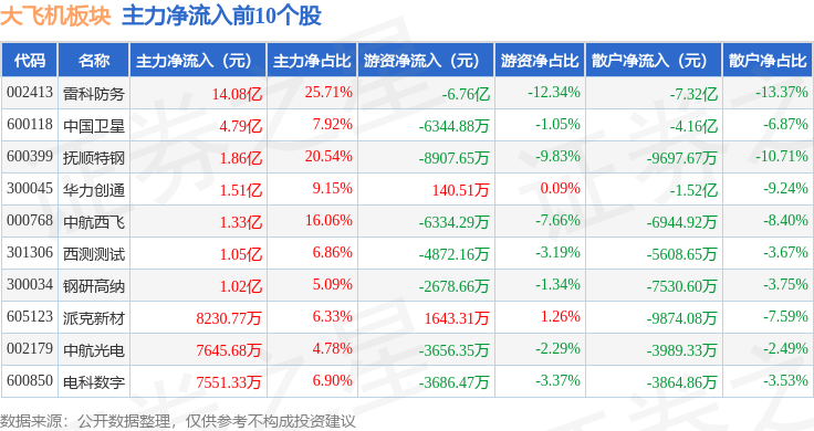 从资金流向上来看,当日大飞机板块主力资金净流出2.63亿元,游资资金净流出7.9亿元,散户资金净流入10.53亿元。大飞机板块个股资金流向见下表: