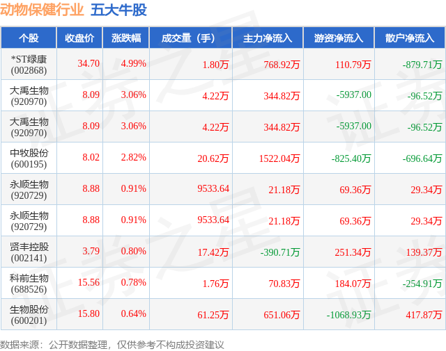 个股表现方面,动物保健行业当日领涨股为*ST绿康(002868),该股当日报收34.7,上涨4.99%,成交量1.8万,主力资金净流入768.92万元。大禹生物(920970)以上涨3.06%紧随其后,该股当日成交量4.22万,主力资金净流入344.82万元。除此之外,大禹生物(920970)、中牧股份(600195)、永顺生物(920729)均进入当日牛股之列。具体个股列表见下表: