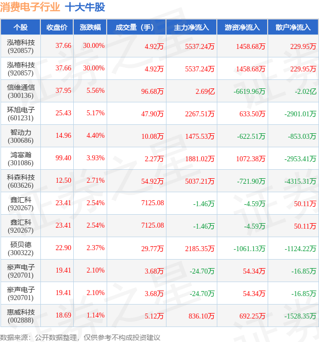 个股表现方面,消费电子行业当日领涨股为泓禧科技(920857),该股当日报收37.66,上涨30.0%,成交量4.92万,主力资金净流入5537.24万元。泓禧科技(920857)以上涨30.0%紧随其后,该股当日成交量4.92万,主力资金净流入5537.24万元。除此之外,信维通信(300136)、环旭电子(601231)、智动力(300686)均进入当日牛股之列。具体个股列表见下表: