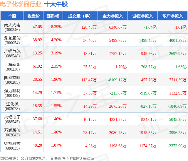 个股表现方面,电子化学品行业当日领涨股为南大光电(300346),该股当日报收47.05,上涨8.39%,成交量128.48万,主力资金净流入6340.67万元。鼎龙股份(300054)以上涨4.2%紧随其后,该股当日成交量36.46万,主力资金净流入5499.72万元。除此之外,广钢气体(688548)、上海新阳(300236)、国瓷材料(300285)均进入当日牛股之列。具体个股列表见下表: