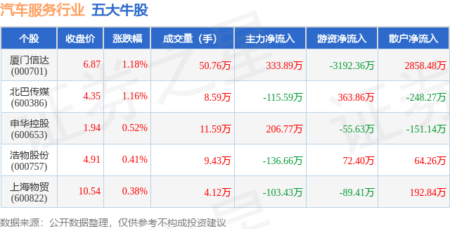 个股表现方面,汽车服务行业当日领涨股为厦门信达(000701),该股当日报收6.87,上涨1.18%,成交量50.76万,主力资金净流入333.89万元。北巴传媒(600386)以上涨1.16%紧随其后,该股当日成交量8.59万,主力资金净流出115.59万元。除此之外,申华控股(600653)、浩物股份(000757)、上海物贸(600822)均进入当日牛股之列。具体个股列表见下表:
