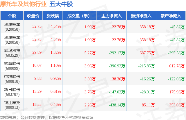 个股表现方面,摩托车及其他行业当日领涨股为华洋赛车(920058),该股当日报收32.73,上涨4.54%,成交量1.99万,主力资金净流入22.78万元。华洋赛车(920058)以上涨4.54%紧随其后,该股当日成交量1.99万,主力资金净流入22.78万元。除此之外,爱玛科技(603529)、林海股份(600099)、中路股份(600818)均进入当日牛股之列。具体个股列表见下表: