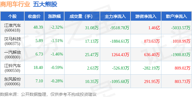 个股表现方面,商用车行业当日领跌股为江淮汽车(600418),该股当日报收48.39,下跌2.32%,成交量31.08万,主力资金净流出9518.78万元。汉马科技(600375)以下跌1.51%紧随其后,该股当日成交量17.13万,主力资金净流出1884.61万元。除此之外,一汽解放(000800)、江铃汽车(000550)、东风股份(600006)均进入当日熊股之列。具体个股列表见下表: