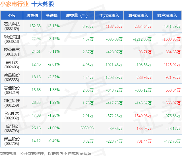 个股表现方面,小家电行业当日领跌股为石头科技(688169),该股当日报收152.68,下跌3.13%,成交量3.95万,主力资金净流入1187.26万元。彩虹集团(003023)以下跌3.12%紧随其后,该股当日成交量4.37万,主力资金净流出396.09万元。除此之外,欧圣电气(301187)、爱仕达(002403)、德昌股份(605555)均进入当日熊股之列。具体个股列表见下表: