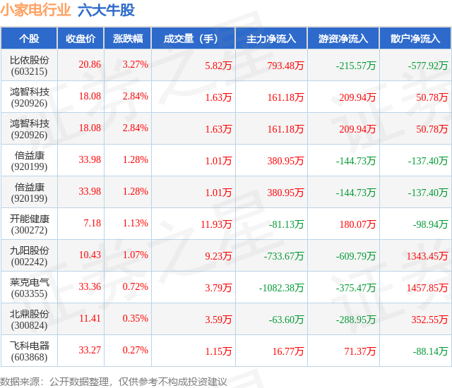 个股表现方面,小家电行业当日领涨股为比依股份(603215),该股当日报收20.86,上涨3.27%,成交量5.82万,主力资金净流入793.48万元。鸿智科技(920926)以上涨2.84%紧随其后,该股当日成交量1.63万,主力资金净流入161.18万元。除此之外,鸿智科技(920926)、倍益康(920199)、倍益康(920199)均进入当日牛股之列。具体个股列表见下表: