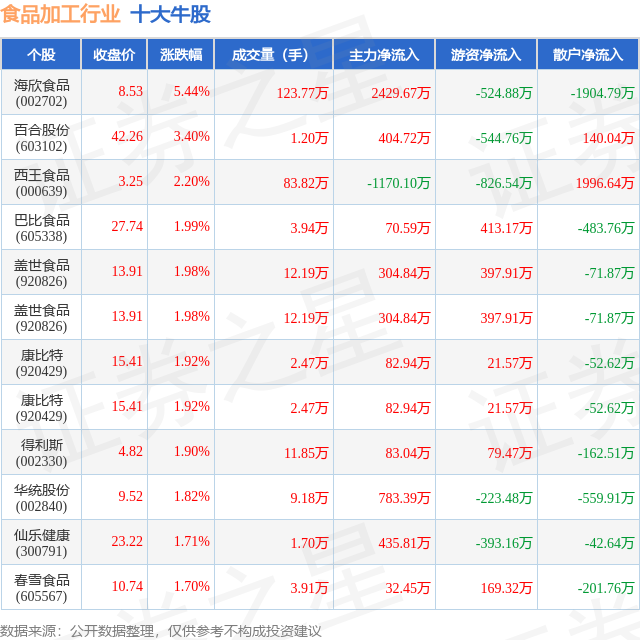 个股表现方面,食品加工行业当日领涨股为海欣食品(002702),该股当日报收8.53,上涨5.44%,成交量123.77万,主力资金净流入2429.67万元。百合股份(603102)以上涨3.4%紧随其后,该股当日成交量1.2万,主力资金净流入404.72万元。除此之外,西王食品(000639)、巴比食品(605338)、盖世食品(920826)均进入当日牛股之列。具体个股列表见下表: