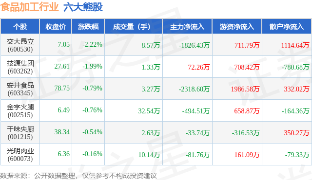 个股表现方面,食品加工行业当日领跌股为交大昂立(600530),该股当日报收7.05,下跌2.22%,成交量8.57万,主力资金净流出1826.43万元。技源集团(603262)以下跌1.99%紧随其后,该股当日成交量1.33万,主力资金净流入72.26万元。除此之外,安井食品(603345)、金字火腿(002515)、千味央厨(001215)均进入当日熊股之列。具体个股列表见下表: