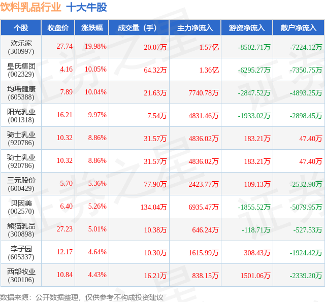 个股表现方面,饮料乳品行业当日领涨股为欢乐家(300997),该股当日报收27.74,上涨19.98%,成交量20.07万,主力资金净流入1.57亿元。皇氏集团(002329)以上涨10.05%紧随其后,该股当日成交量64.32万,主力资金净流入1.36亿元。除此之外,均瑶健康(605388)、阳光乳业(001318)、骑士乳业(920786)均进入当日牛股之列。具体个股列表见下表:
